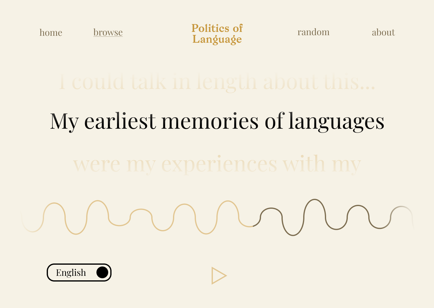 We plan on interviewing each other, as well as three people from our respective communities (friends and family) who will answer in the language of their choice. In terms of output, we plan on showcasing our audio on a website. The website’s taxonomy and interactivity, however, is still a work in progress and will be driven by the content of our interviews. Since we are leaning towards a non-linear storytelling approach, we’re thinking of extracting segments from each interview and grouping them with other similar segments. This way, visitors can select the category they’re interested in and listen to, skip forward, and skip backwards through segments this way.